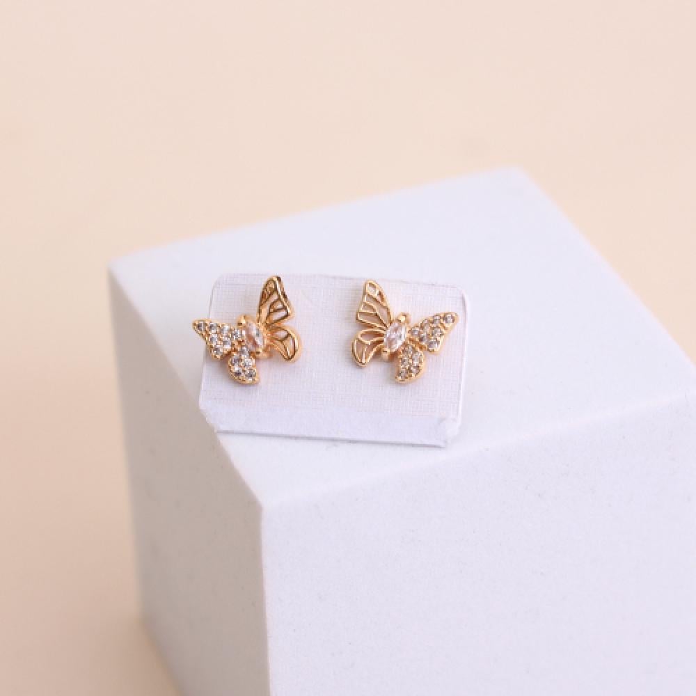 أضيفي لمسة من الجمال والرقة على إطلالة طفلتكِ مع هذا الحلق الذهبي المميز على شكل فراشة، والمصنوع من النحاس عالي الجودة ومرصع بالكريستال البراق.