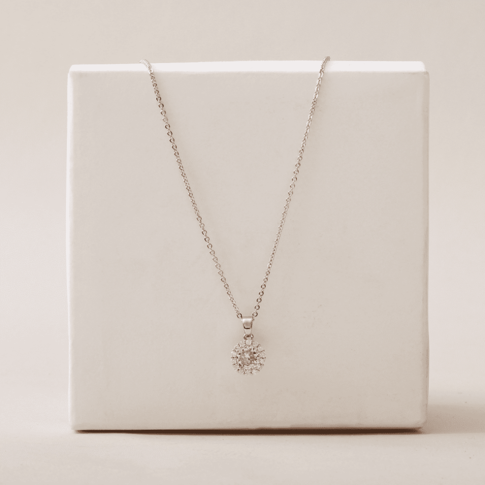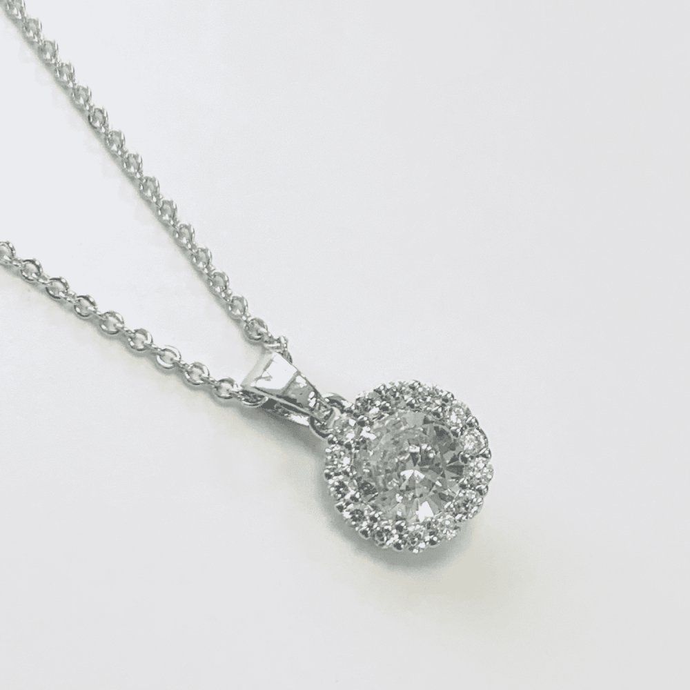 عقد سلسال فضي راقٍ يتميز بحلية دائرية مرصعة بالكريستال البراق. التصميم يجمع بين الفخامة والبساطة مع حجر مركزي محاط بإطار من الكريستال اللامع.